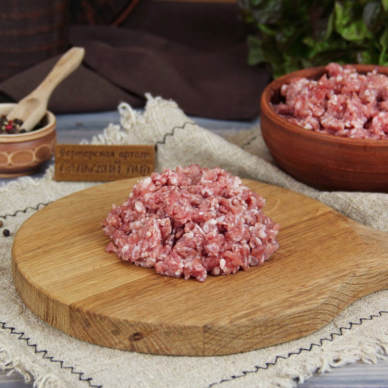 Хорошо прокрученный нежный, сочный фарш из свинины и говядины в соотношении 50/50. Используется для домашнего приготовления котлет, тефтелей, пельменей, рулетов, мясных колец, запеченных блюд.