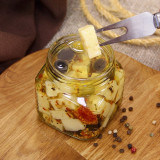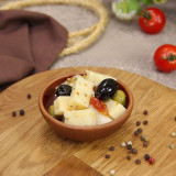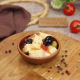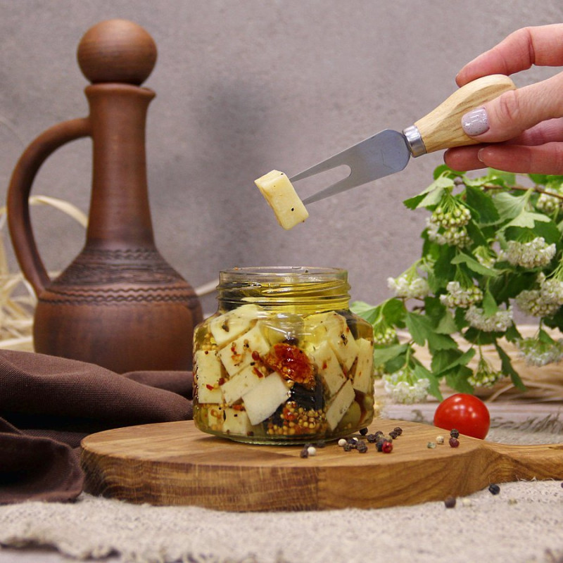 Сыр из коровьего молока с добавлением сливок, маринованный в оливковом и подсолнечном масле в разнообразных специях для придания сыру особого вкуса. Является утончённой закуской для любителей авторских сырных блюд. Вкус сыра хорошо выраженный, специи качественно оттеняют его, создавая чуть масляное первовкусие.